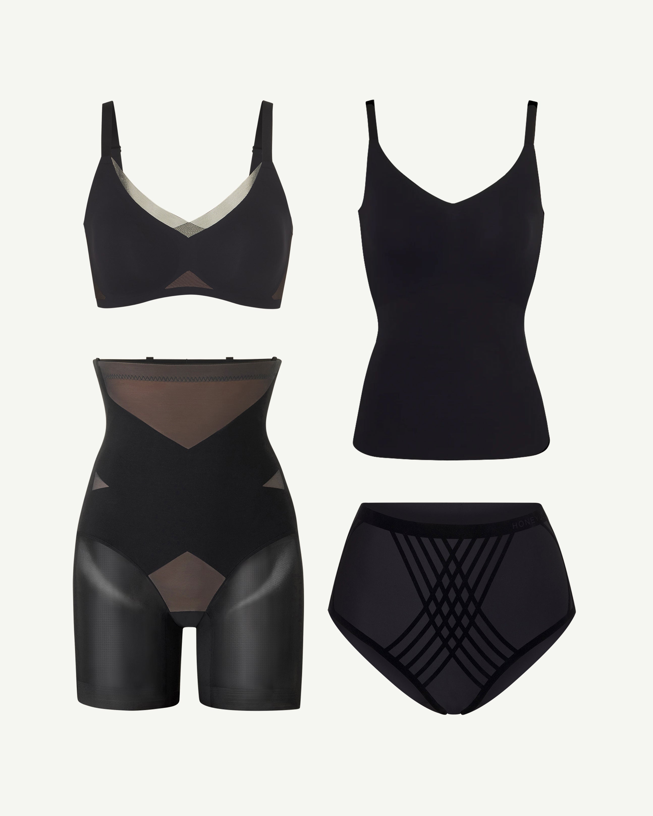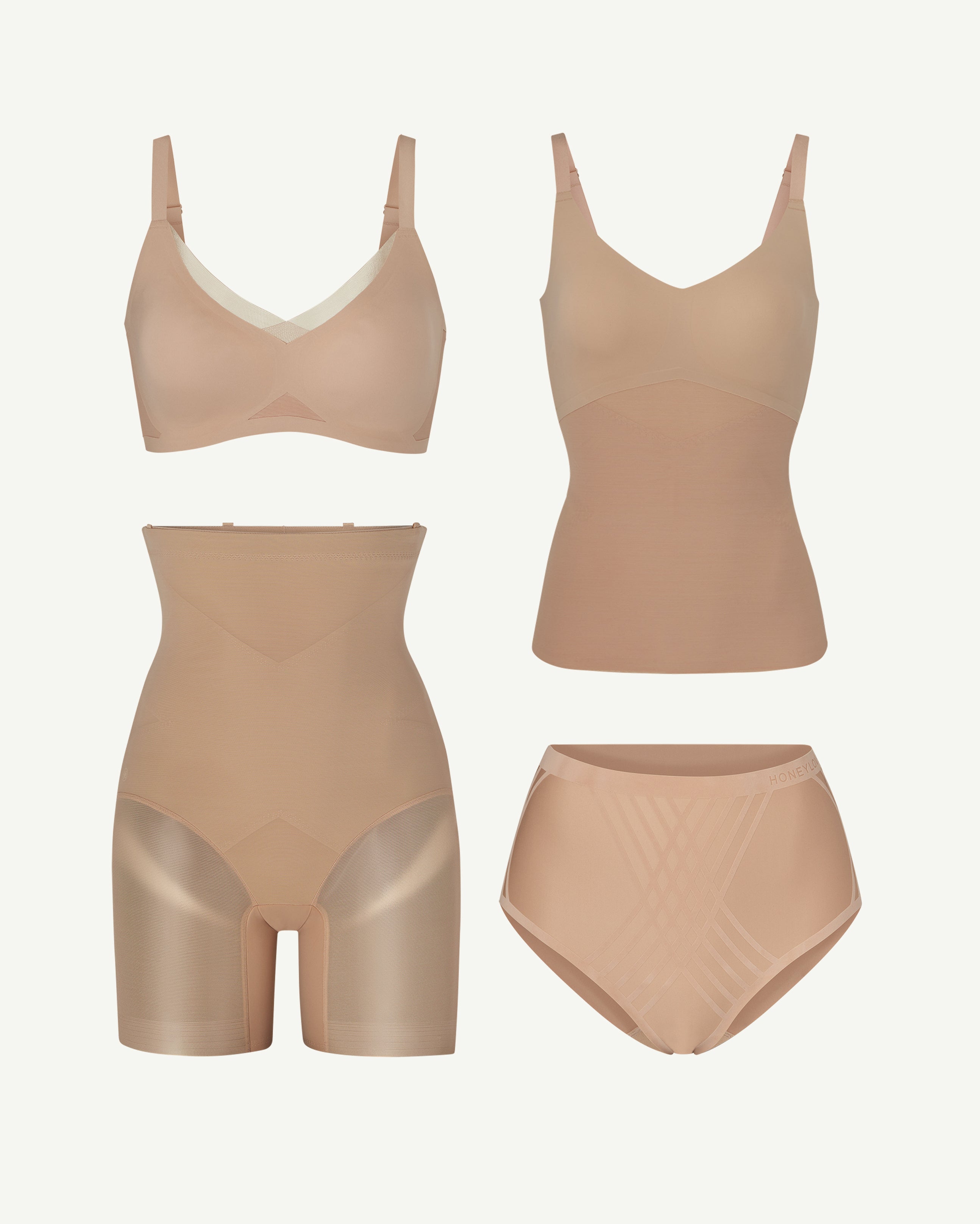 Get Honeylove’s SuperPower Short. Silhouette Brief. CrossOver Bra. and LiftWear Cami and save.