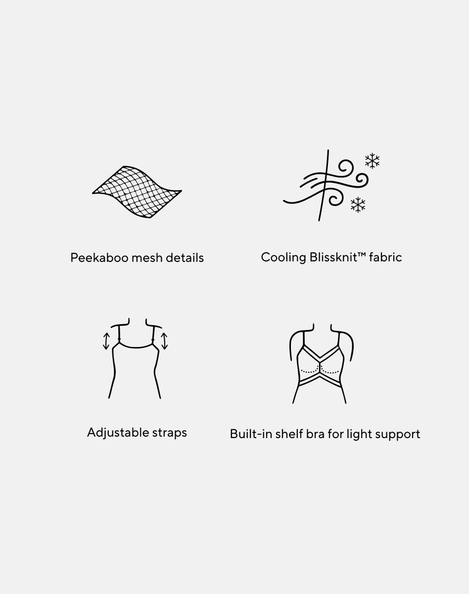 Your best sleep ever awaits. TENCEL™ Blissknit™ fabric is buttery soft against skin and ultra breathable to keep you comfortable and cool all night long. Mesh panels let in extra airflow. A light shelf bra keeps you held in place. and adjustable straps let you customize your fit.