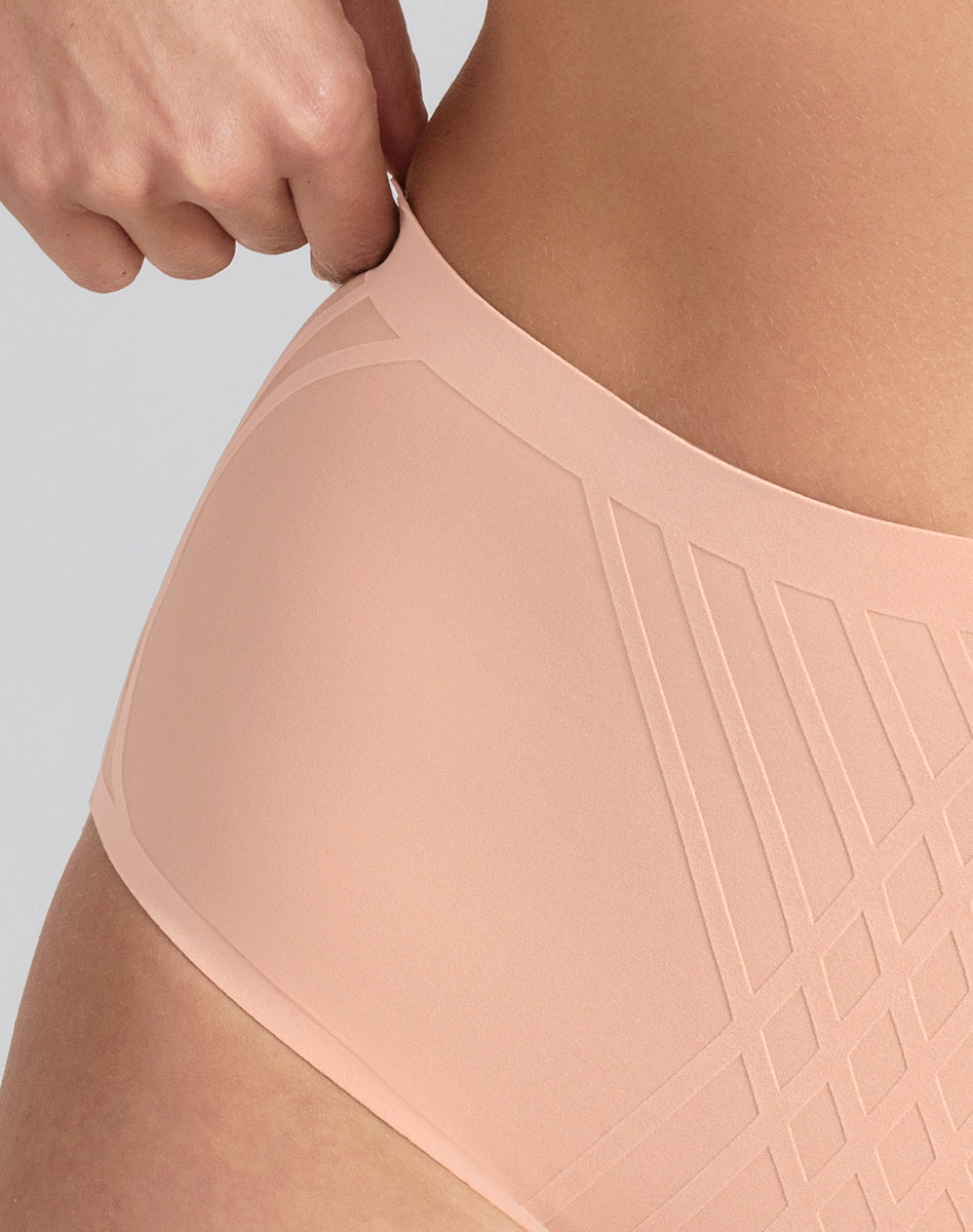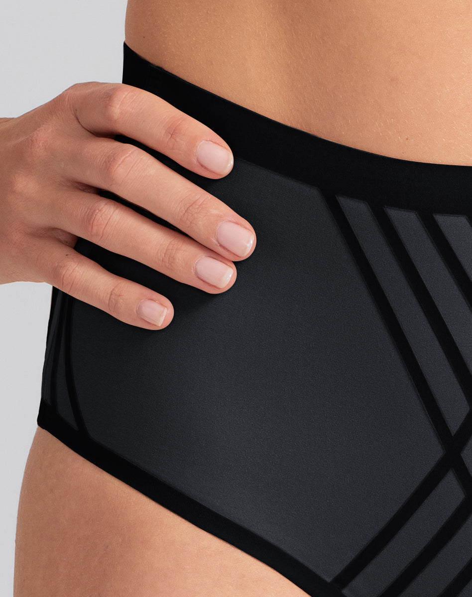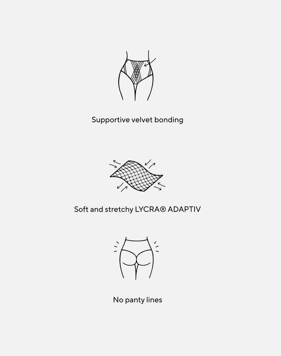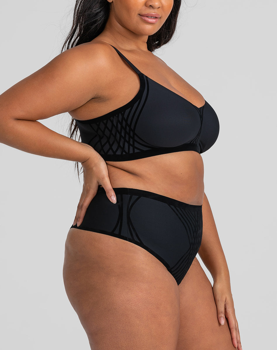 This high-waisted thong underwear features flat. stretch silicone coated in soft velvetine flocking for flexible support. Made with LYCRA® ADAPTIV fibers for a high-recovery stretch that moves with your body and provides light smoothing. The garment’s thong shape eliminates any chance of panty lines. Pair it with the Silhouette Bra to make a matching set.
